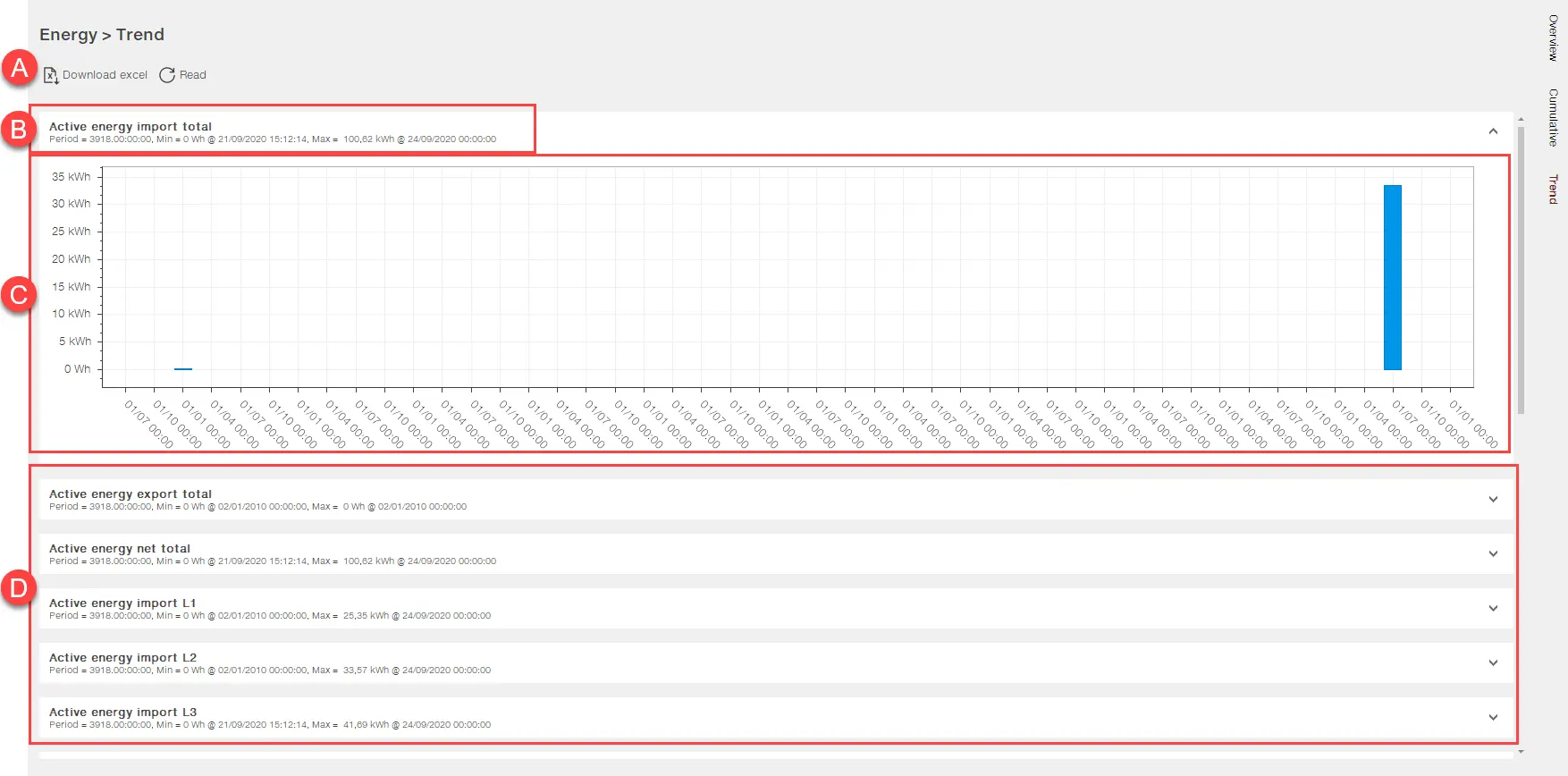 | الطاقة النشطة | قيم الطاقة النشطة لكل طور ومجموع القواعد، المستوردة أو المصدرة، حسب ما يتم اختياره في [A] |