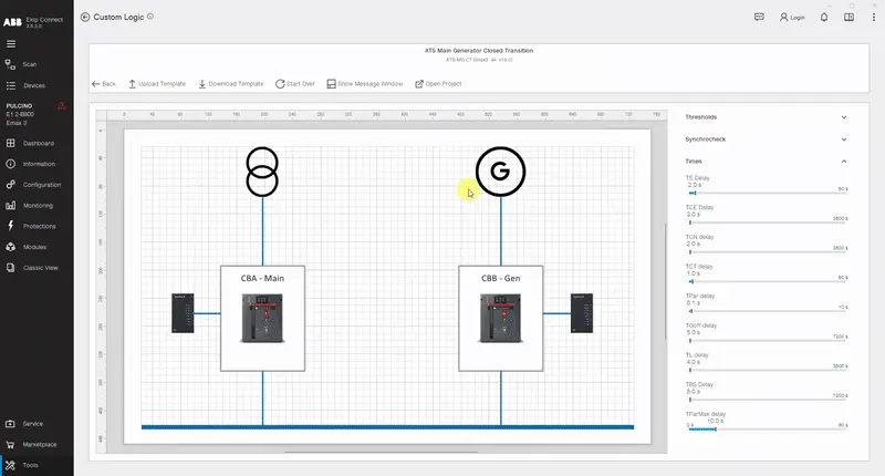 След отваряне на шаблона можете да направите фино настройване на праговете, Synchrocheck (ако има налични) и Времеви забавяния. След като изберете желаните параметри, свържете се към прекъсвач Emax 3 и кликнете върху "Upload Template". След това избери ролята, която искаш прекъсвачът да поеме в ATS конфигурацията, провери материалната листа и кликни "Качи".