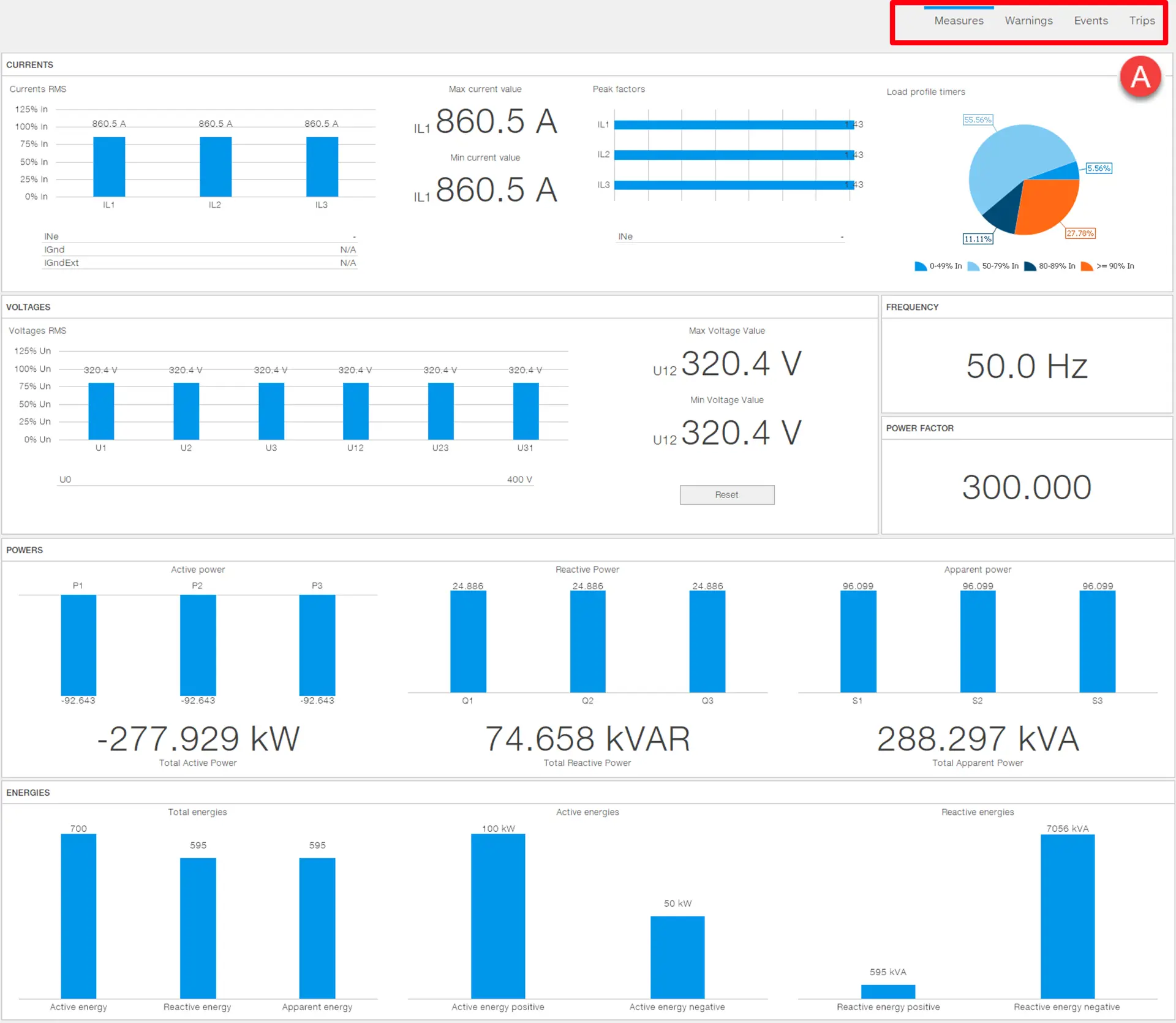 • Max. current value: maximum phase current measured. Value calculated since power was supplied to the device or since the last manual reset.