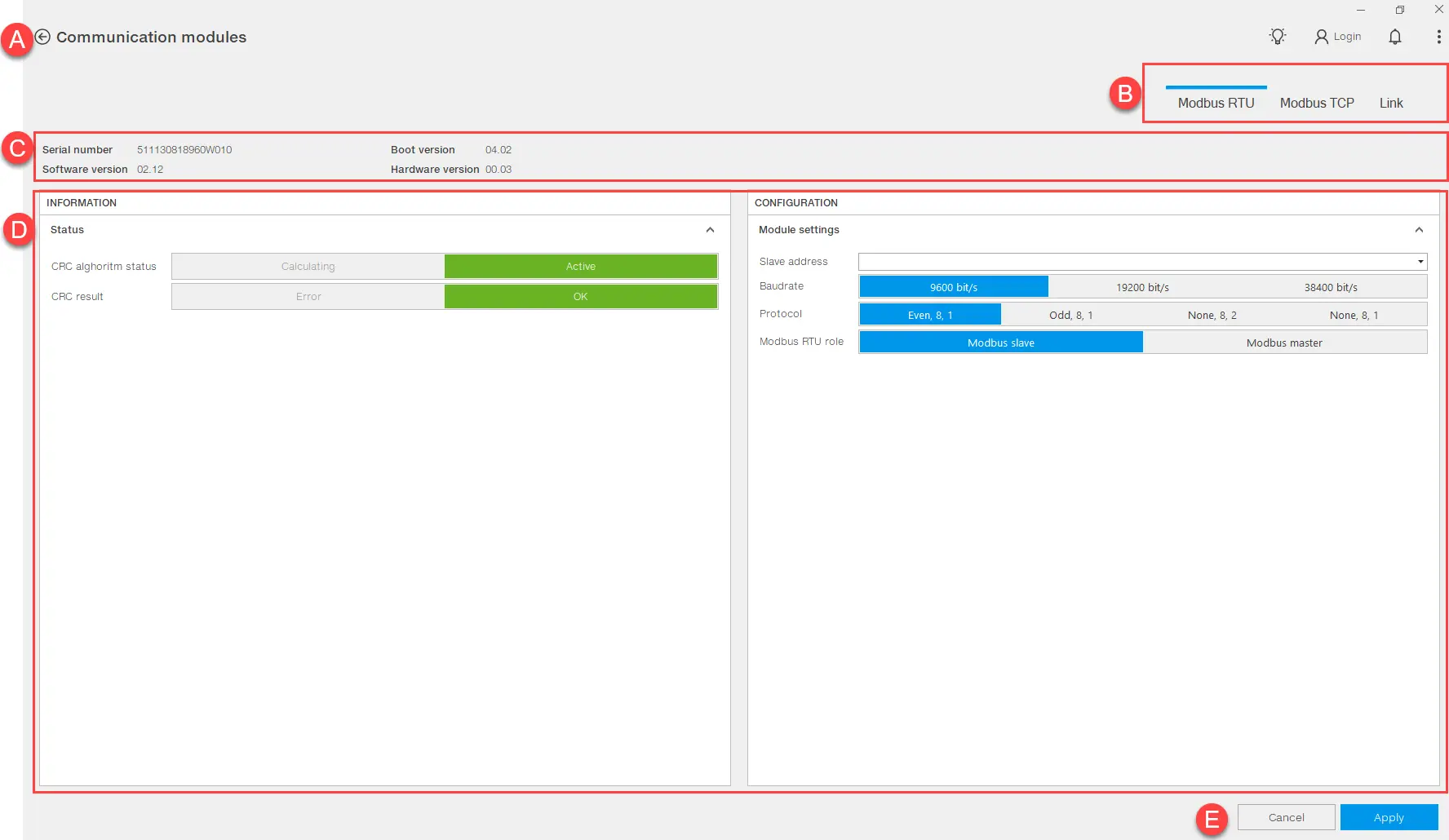 स्थिति: मॉड्यूल स्थिति की जानकारी कॉन्फ़िगरेशन: मॉड्यूल कॉन्फ़िगरेशन पैरामीटर