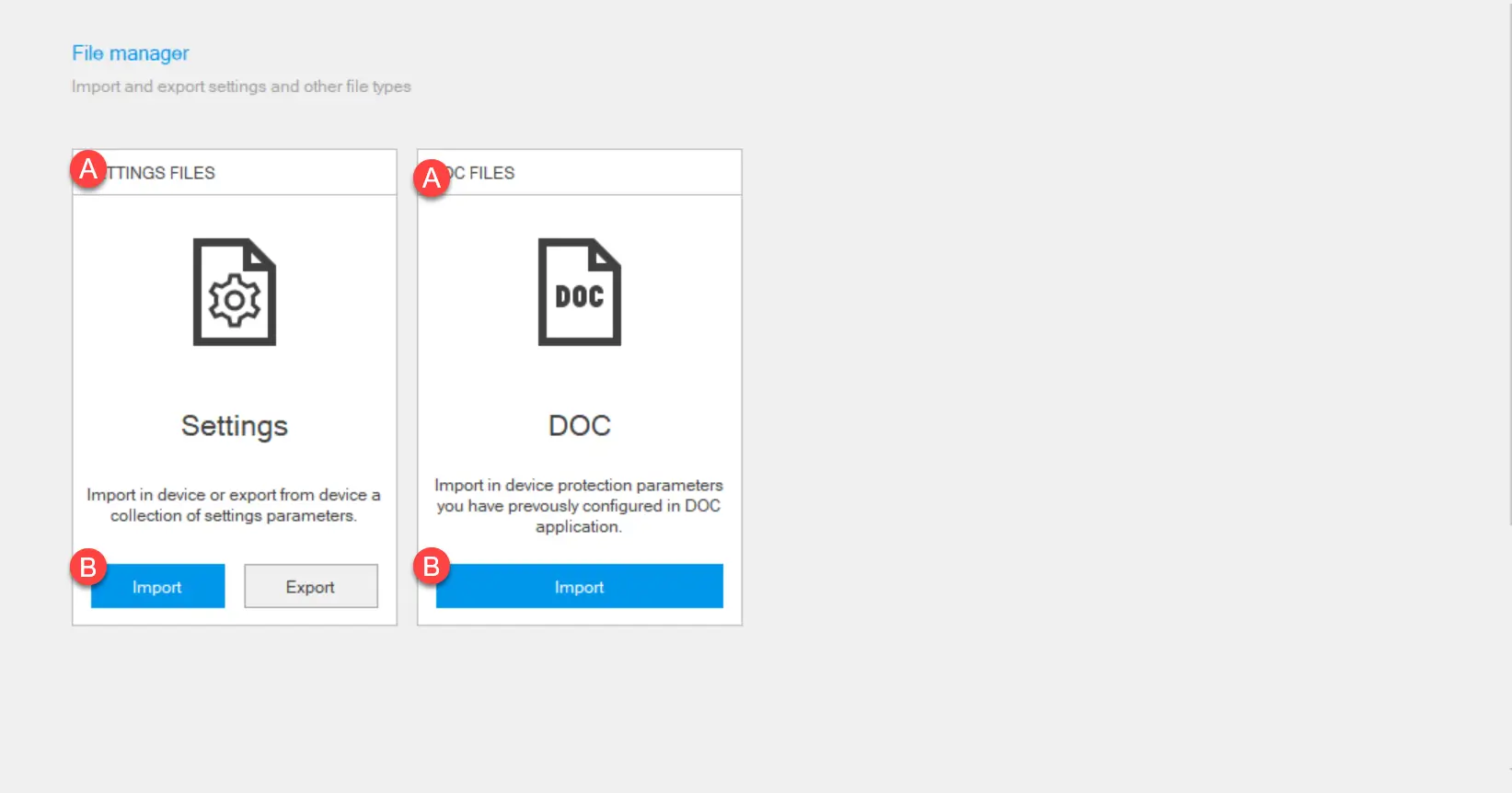 A Fájlkezelő funkció lehetővé teszi, hogy exportáljuk az eszközön konfigurált paramétereket, elmentsük őket a PC-re, majd importáljunk egy másik azonos típusú eszközre a konfigurálás megkönnyítése érdekében.
