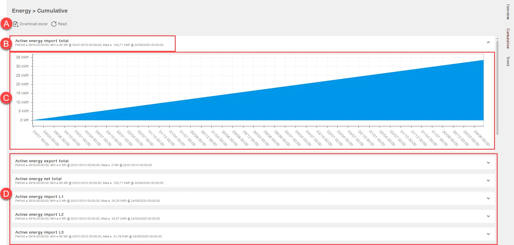 | A | Menu per visualizzare i valori energetici importati ed esportati |