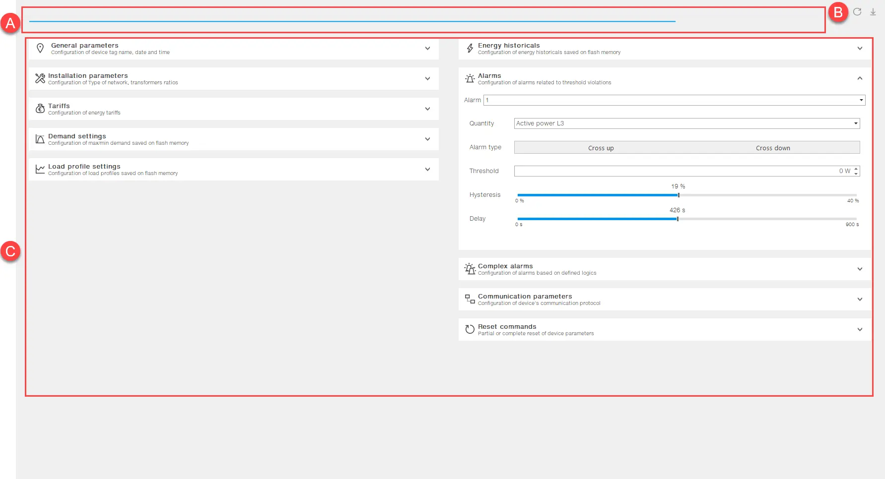 パラメータセクションを展開して設定します:Ekip Connectはデバイスから値を読み取り、進行状況バーが表示されます。