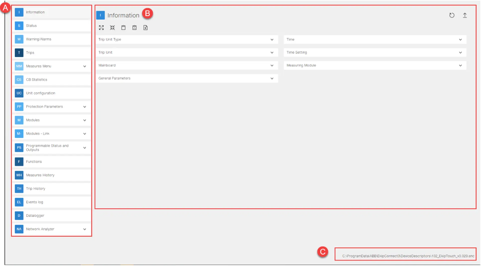 B | A 에서 선택한 매개변수 범주에 특화된 매개변수 영역  : 모든 매개변수 섹션을 확장합니다.  : 모든 매개변수 섹션을 압축합니다.  : 모든 콘텐츠, 이름, 값이 클립보드에 복사됩니다.  : 클립보드에 값만 복사합니다.  : 매개변수와 값을 .xls로 내보냅니다.  : 는 장치에서 저장된 값을 읽습니다.  : 가 장치에 설정된 값을 기록합니다. |