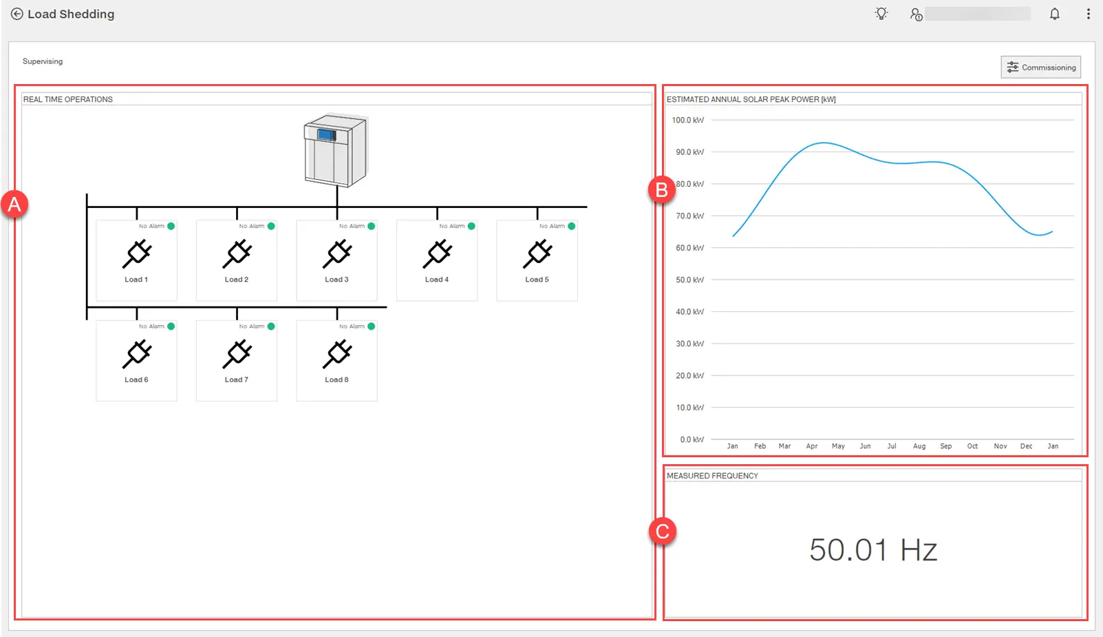 - 버튼: 모든 부하의 경보를 재설정하는 경 보 를 재설정하며, 페이지 '감독'에서 확인할 수 있습니다.