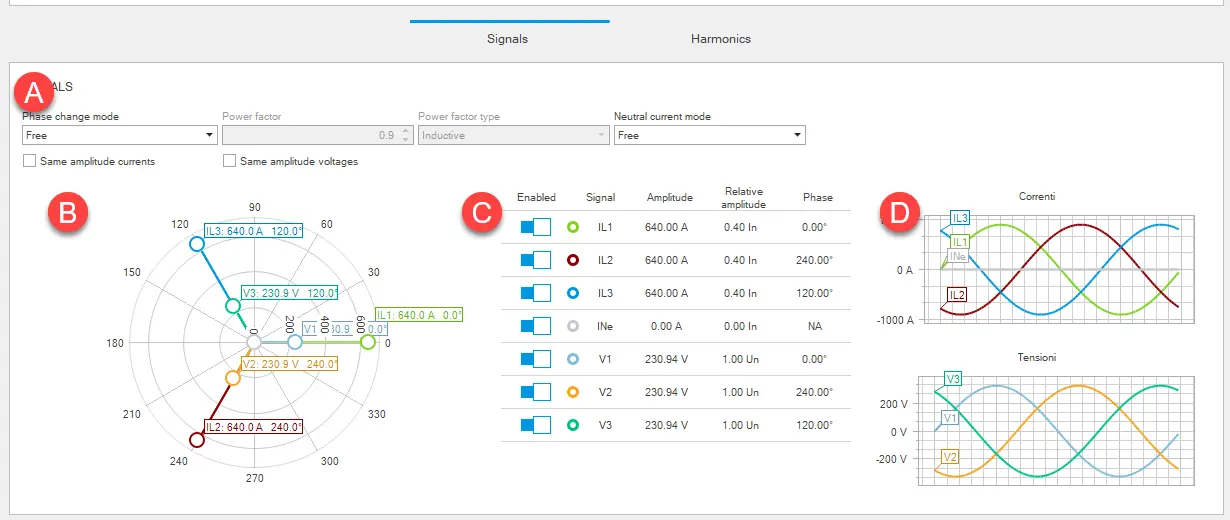 | C | 신호 표: 테스트 신호의 기본 성분의 진폭과 위상 차이의 수치값을 변경할 수 있게 해줍니다. 진폭은 상대형(정격 전류/전압)과 절대형(암페르/볼트) 모두로 표현할 수 있습니다. |