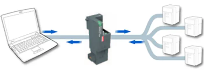 >> Išsamesnės informacijos apie tinklo konfigūraciją rasite dokumente "Ryšys per magistralę su ABB grandinės pertraukikliais", kurį rasite čia.Kituose įrenginiuose, kuriuose yra Ethernet prievadas, prijunkite Ethernet kabelį tiesiai prie įrenginio.