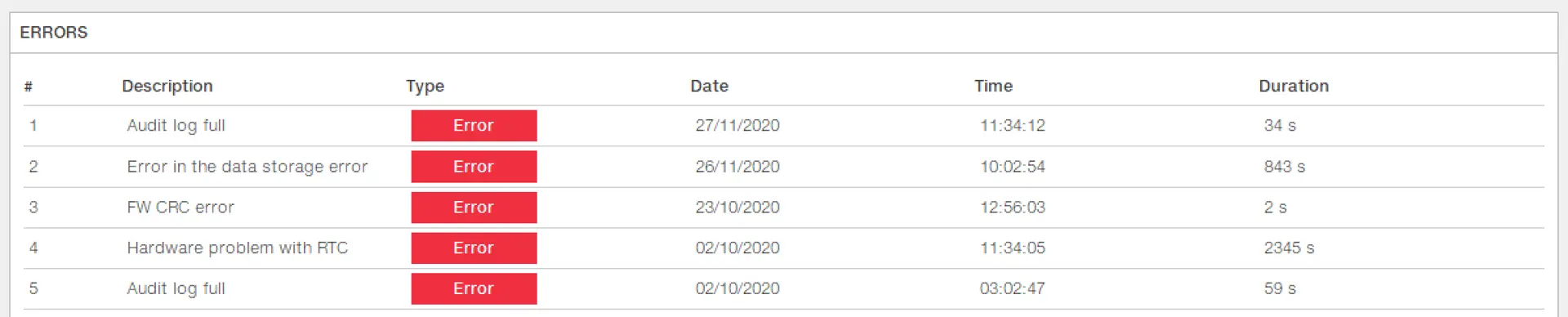 FoutenDeze pagina toont de foutmeldingen met betrekking tot apparaatdiagnostiek in chronologische volgorde. Voor elke fout worden de beschrijving, datum en tijd van opname en duur weergegeven.