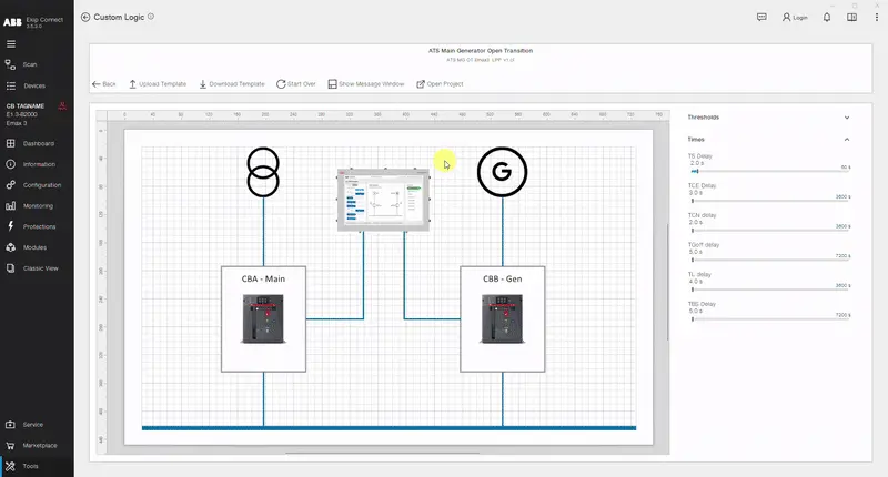 Po otvorení šablóny môžete vykonať jemné doladenie prahov, synchronizácie ( ak je prítomný) a časových oneskorení. Po výbere požadovaných parametrov sa pripojte na istič Emax 3 a kliknite na "Nahrať šablónu". Potom si vyberte rolu, ktorú má istič v ATS konfigurácii prevziať, skontrolujte materiálny zoznam a kliknite na "Nahrať".