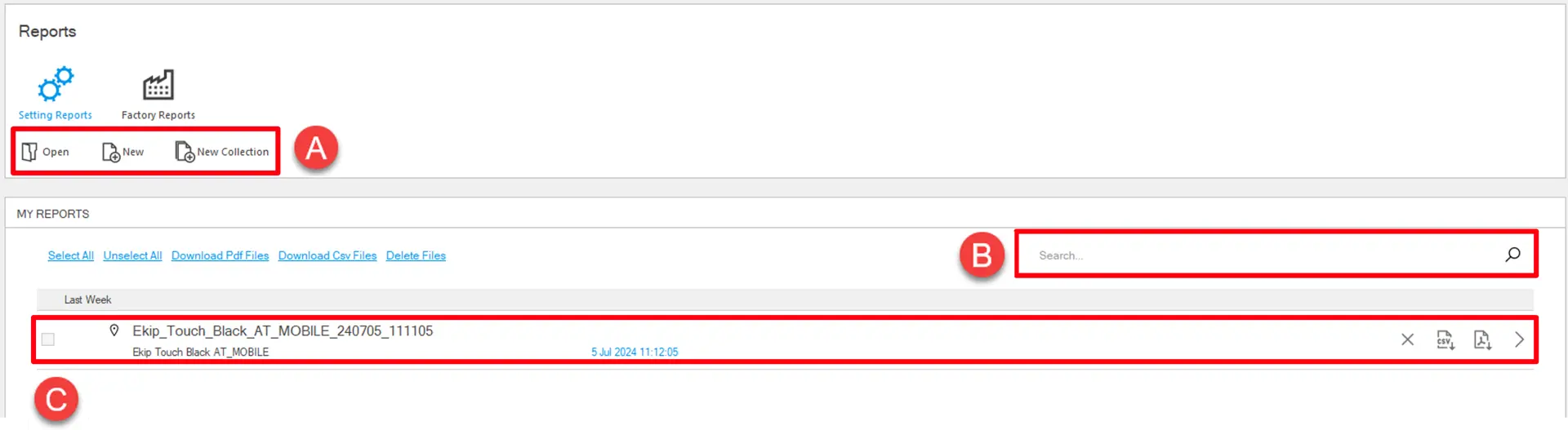 Otvorte správu uloženú na PCV sekcii Nástroje > Správy kliknite na Otvoriť a vyberte .pdf alebo .csv súbor správy, ktorá bola predtým vygenerovaná a stiahnutá pomocou Ekip Connect: správa sa otvorí.