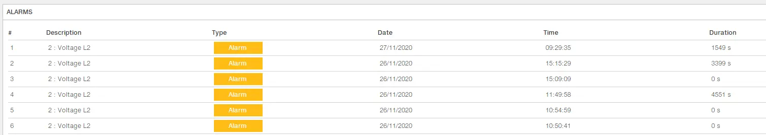 หน้านี้แสดงข้อความเตือนที่เกี่ยวข้องกับสภาวะของระบบหรือการตั้งค่าอุปกรณ์ตามลําดับเวลา สําหรับคําเตือนแต่ละครั้ง จะมีการแสดงคําอธิบาย วันที่และเวลาที่บันทึก และระยะเวลา